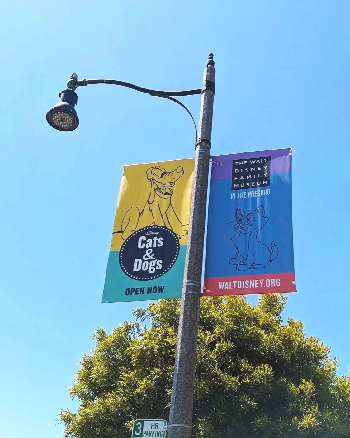 Street banners promoting Disney Cats & Dogs at The Walt Disney Family Museum in the Presidio.