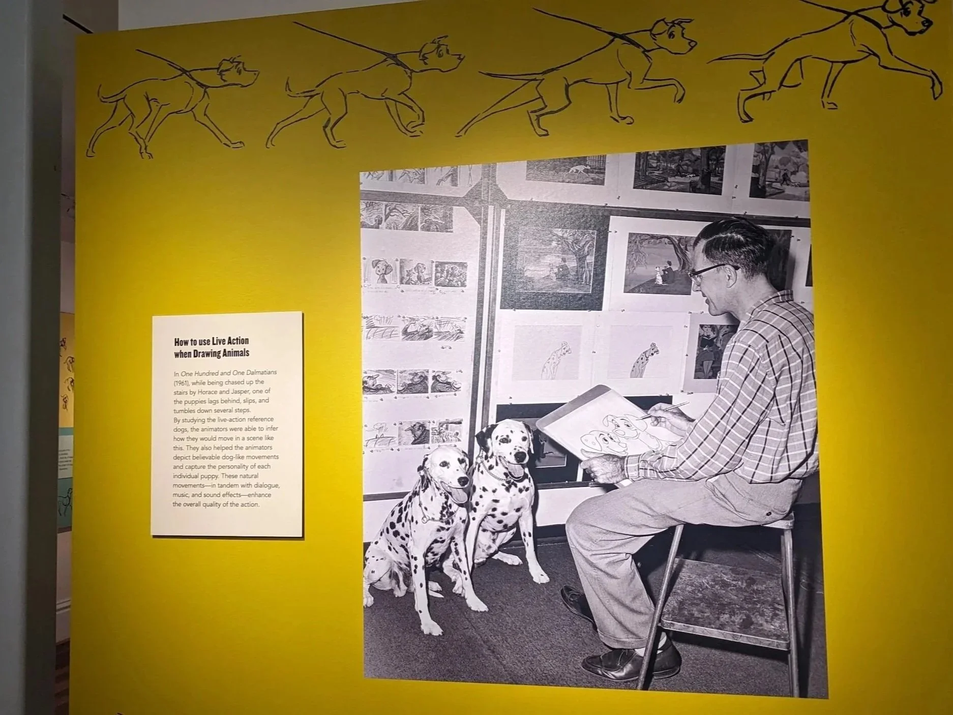 Exhibit panel showing how animators used live-action reference for One Hundred and One Dalmatians (1961).