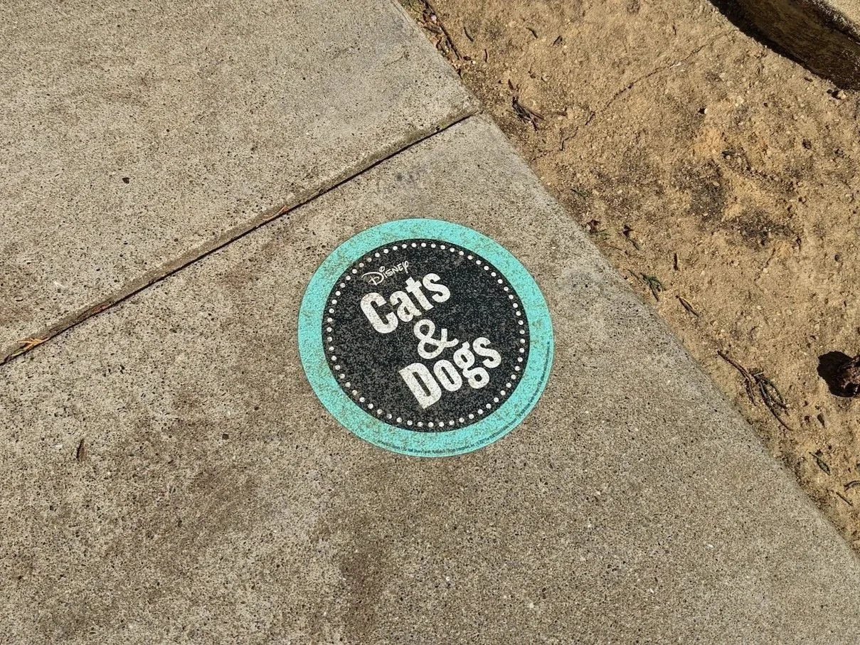 Sidewalk decal pointing the way to the Disney Cats & Dogs exhibition.